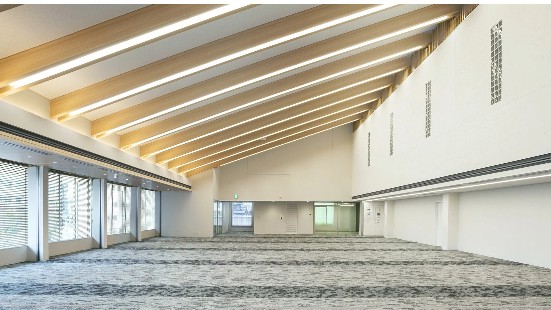 大屋根を感じる傾斜天井の大空間には銀行窓口・待合機能が入り、登り梁の頂部からは柔らかい自然の光が入り込み、職人のまち八女に相応しい、素材感があり温かみのある、藁ふさが混ざった土壁を優しく照らす。