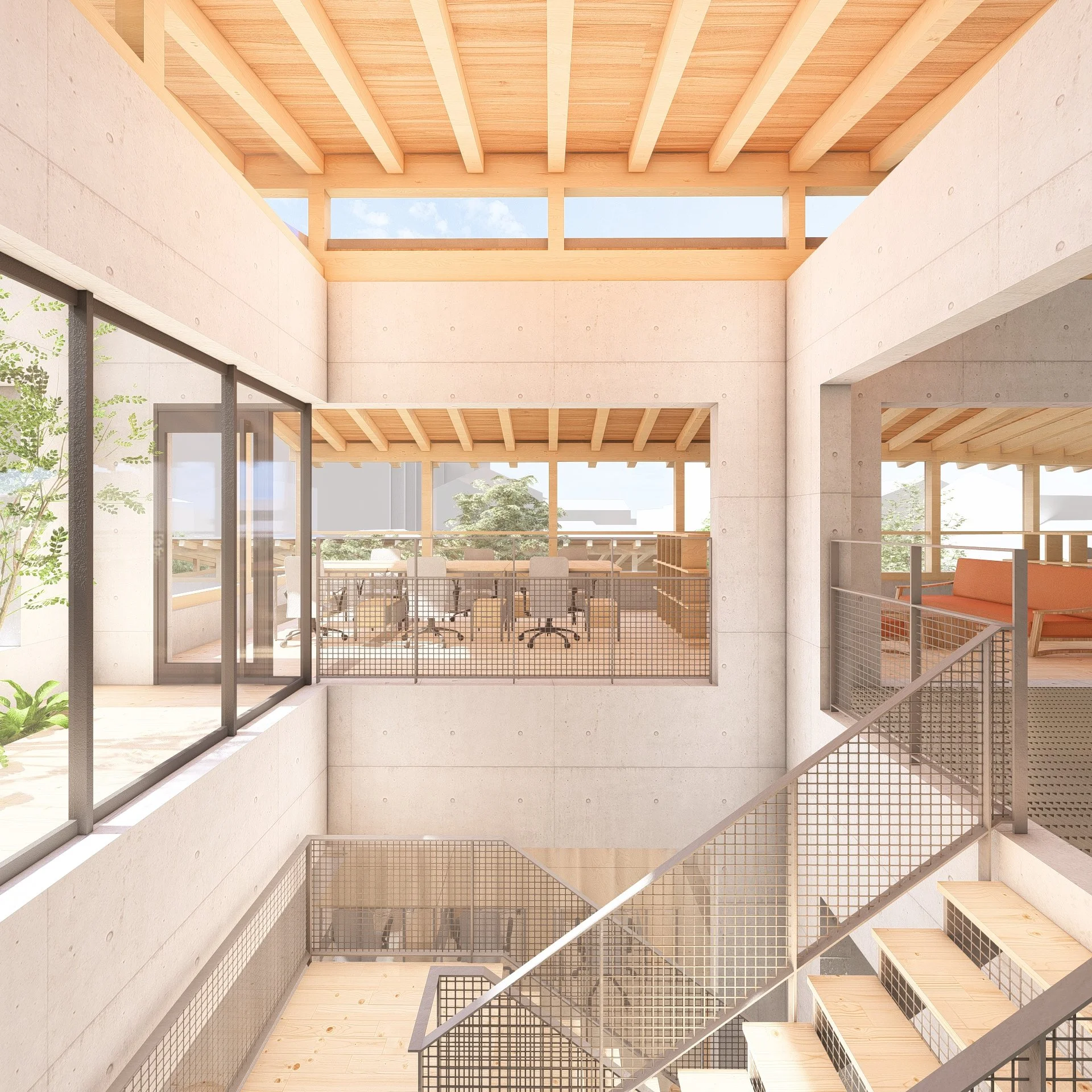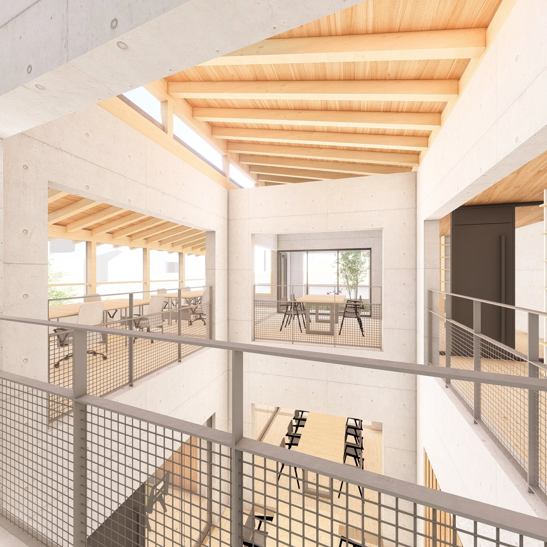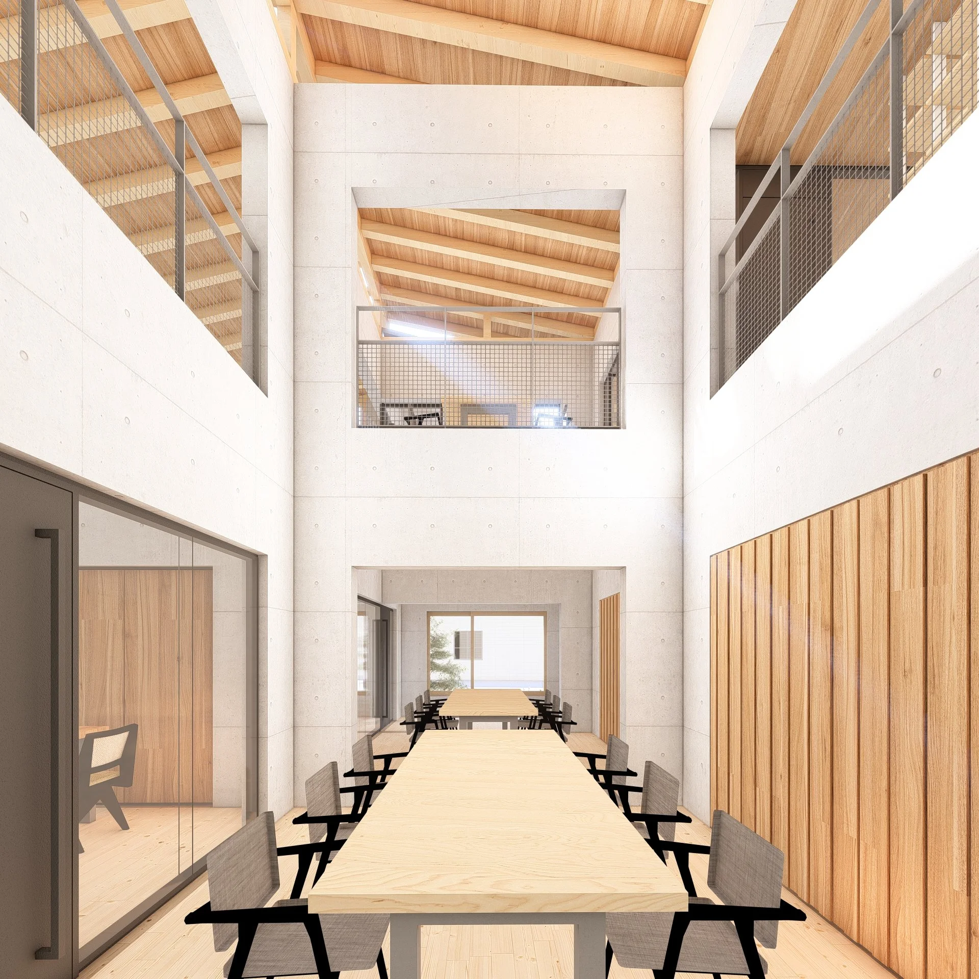 このグリッドは、奥行きのある2階オフィス、光の届きにくい1階へ光を導く“縦の抜け”をつくり、気配をつなげ、風を通す“横の抜け”もつくる。