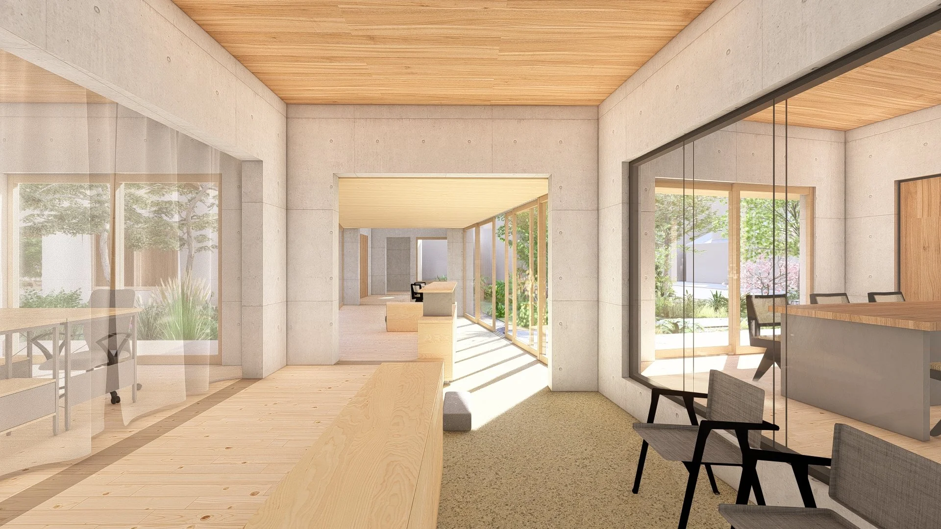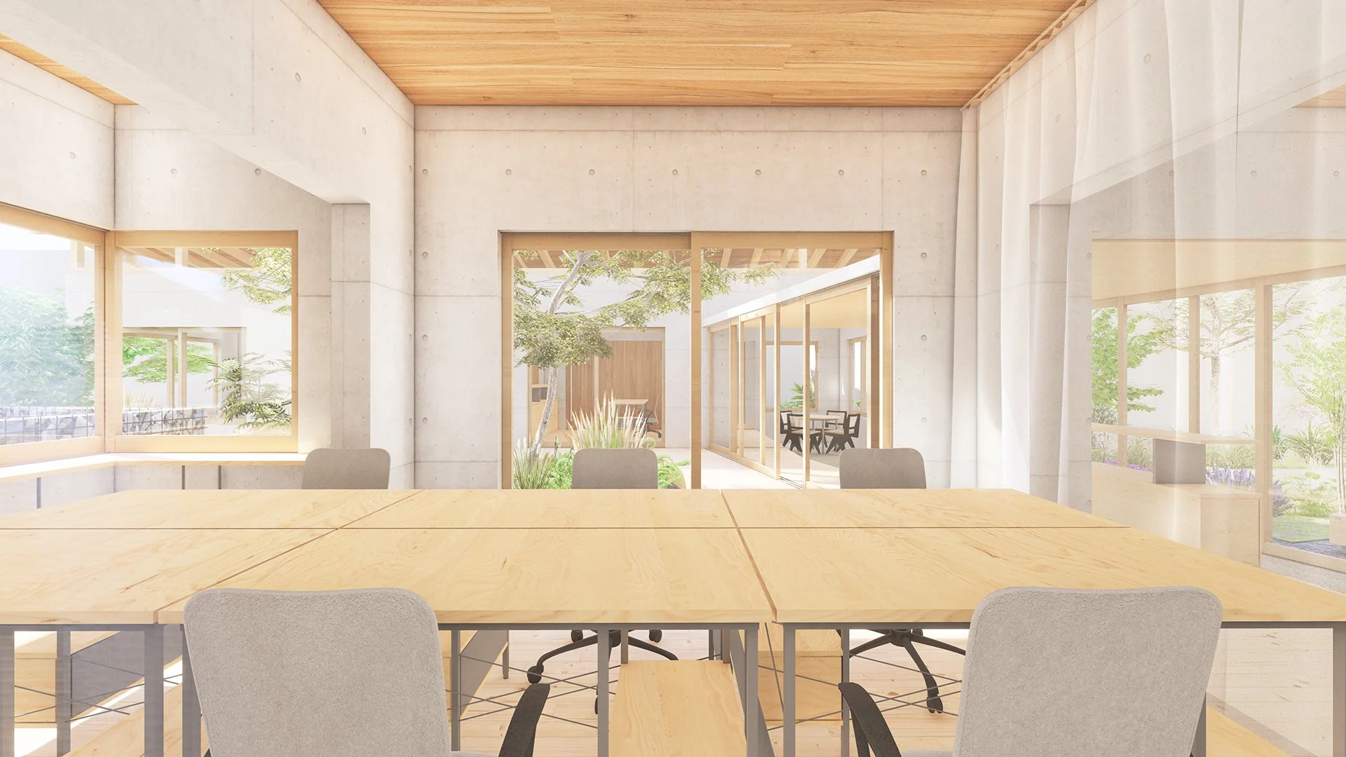 その敷地の声に耳を良く澄ましてみると、光が差し、川から涼しい風が抜ける住宅地の“すき間”があることに気づく。その自然に抗わず、建物自身で光や川風を遮らないよう、建物を分節し、密集する住宅地に「緑の谷」を通すような建物配置を考えた。