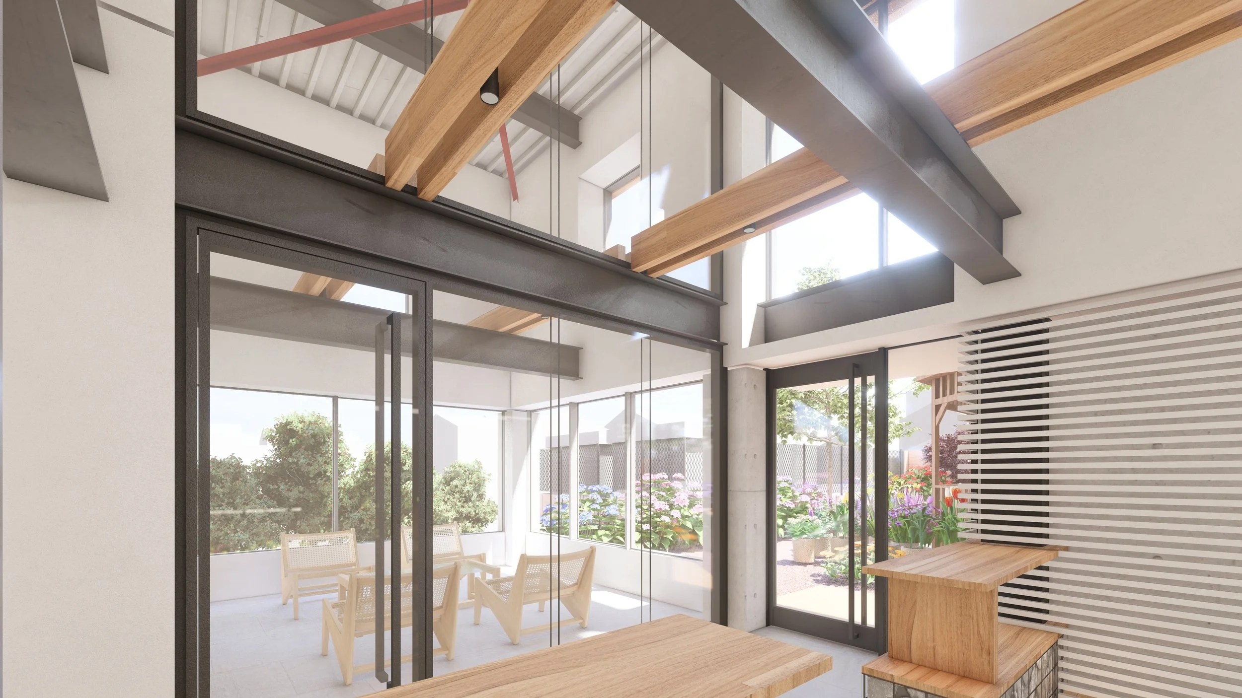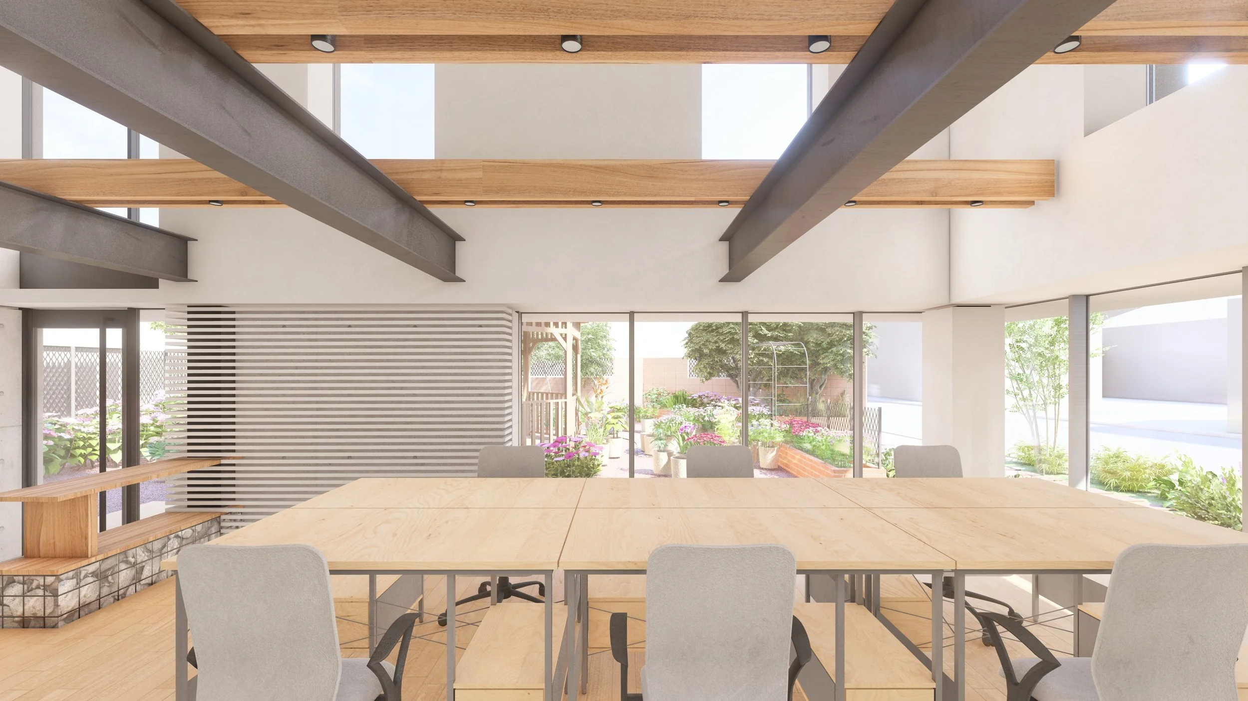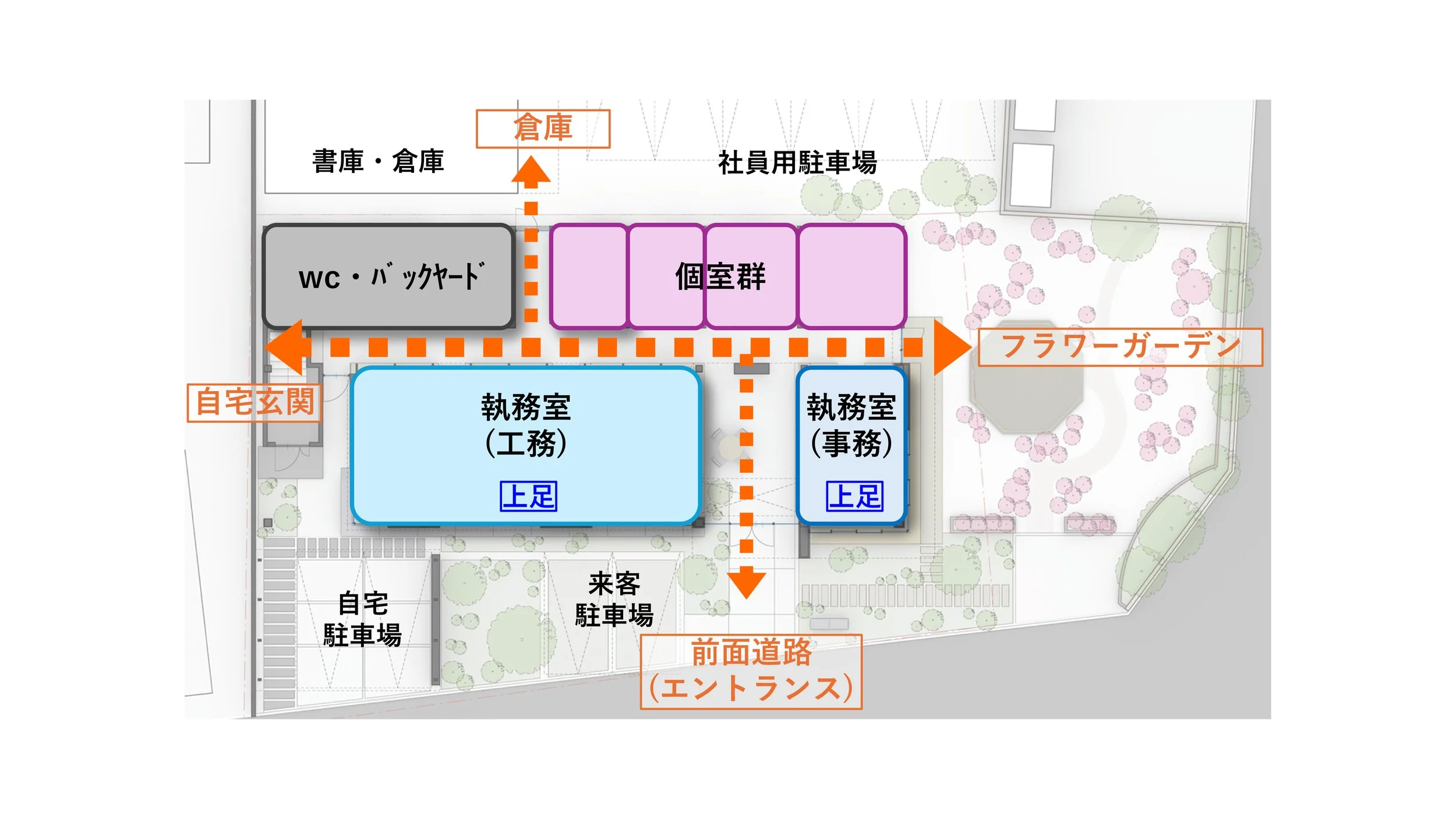 既存ストック同士が連携でき、今後の使い勝手が良いよう、自宅下ピロティ駐車場を、通り抜けが出来るオープンオフィスとして生まれ変わらせる。