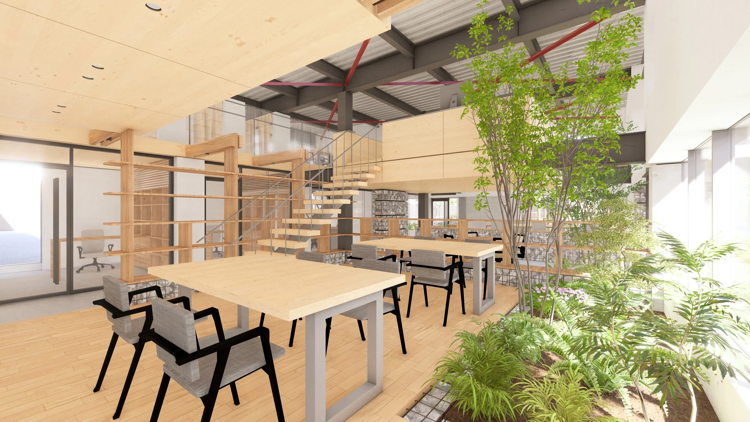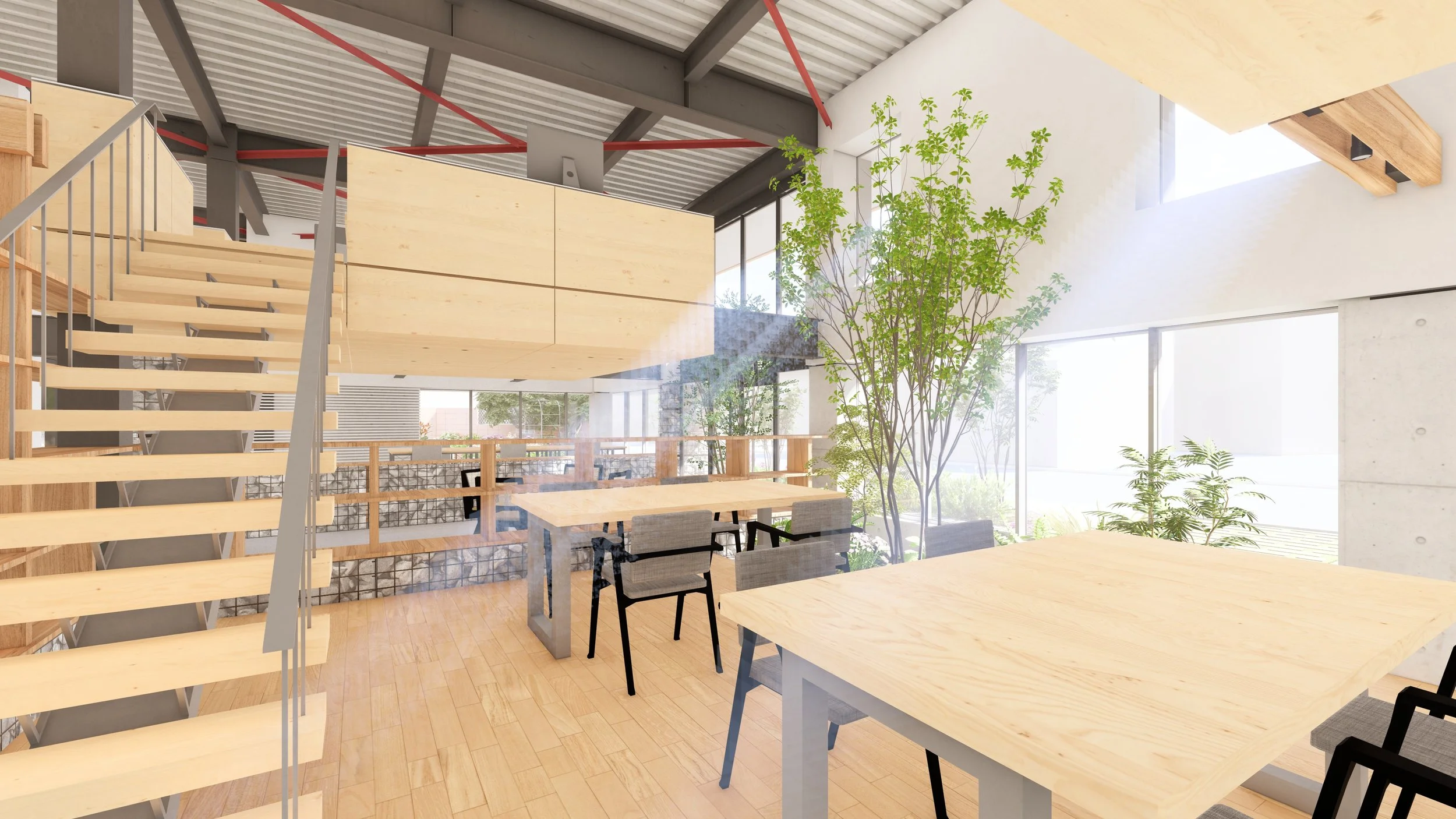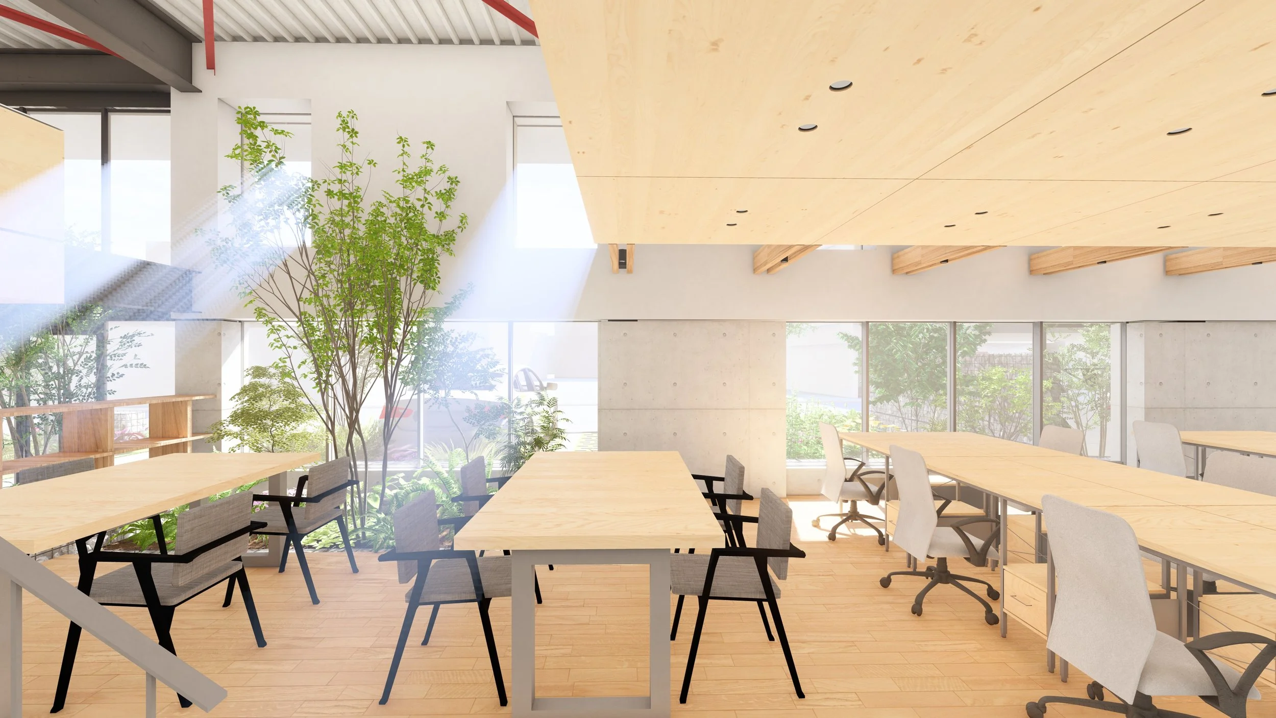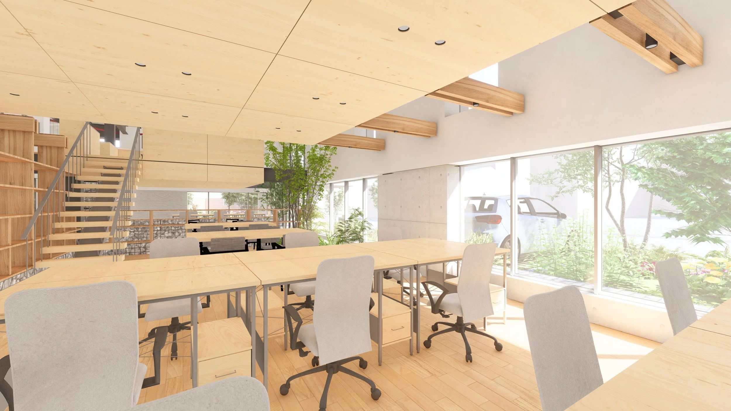オープンオフィスへ、2つの“木のハコ”を浮かせることを考えた。