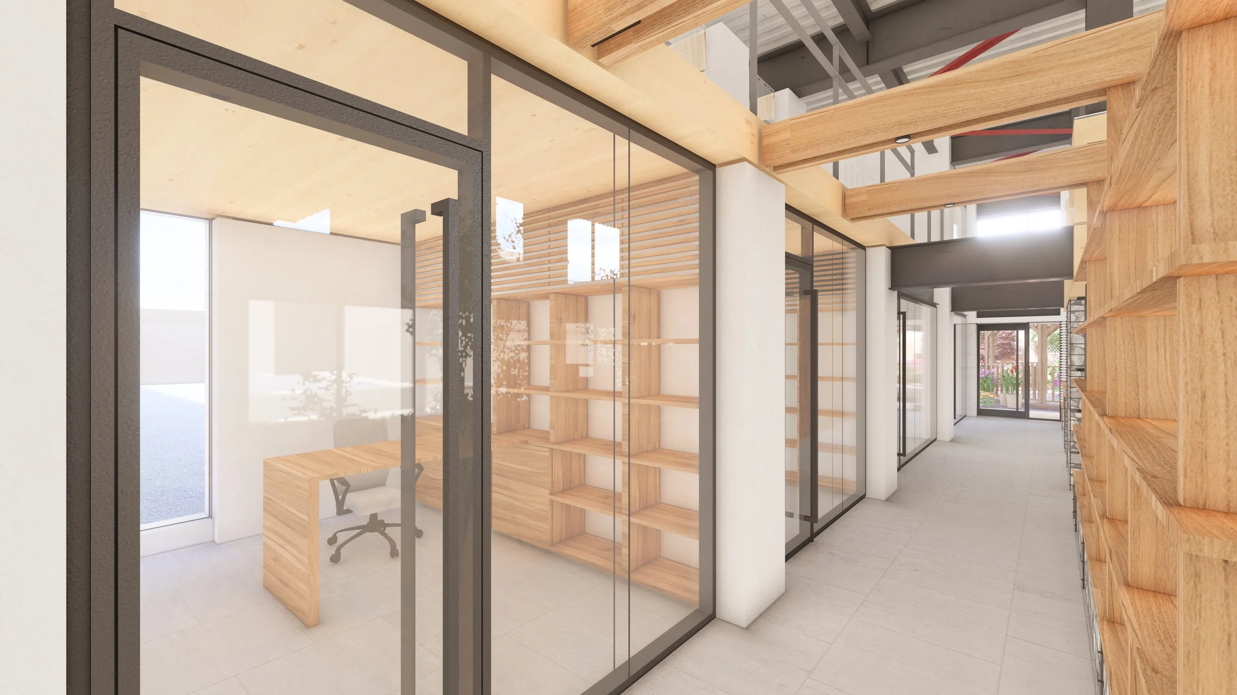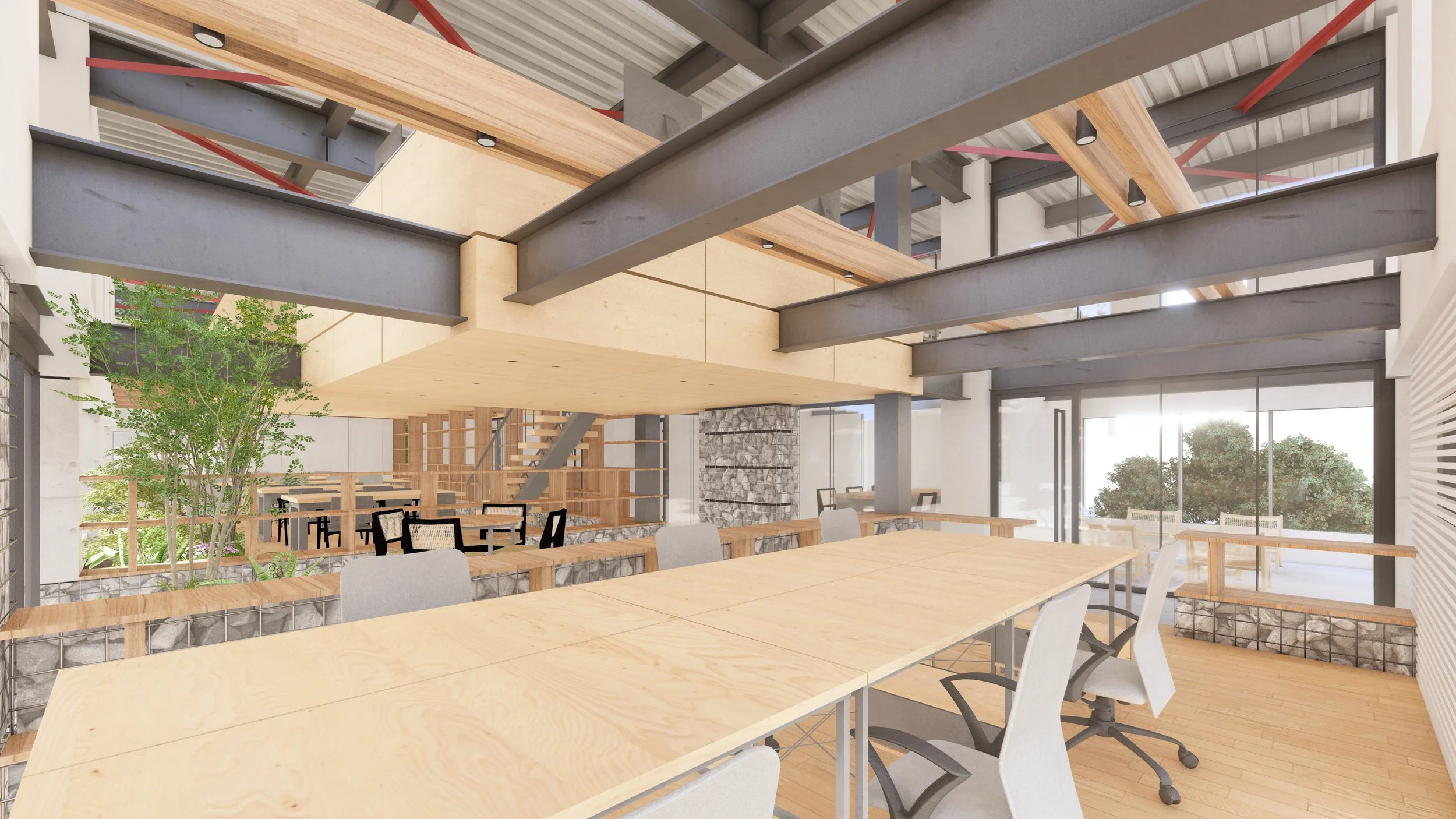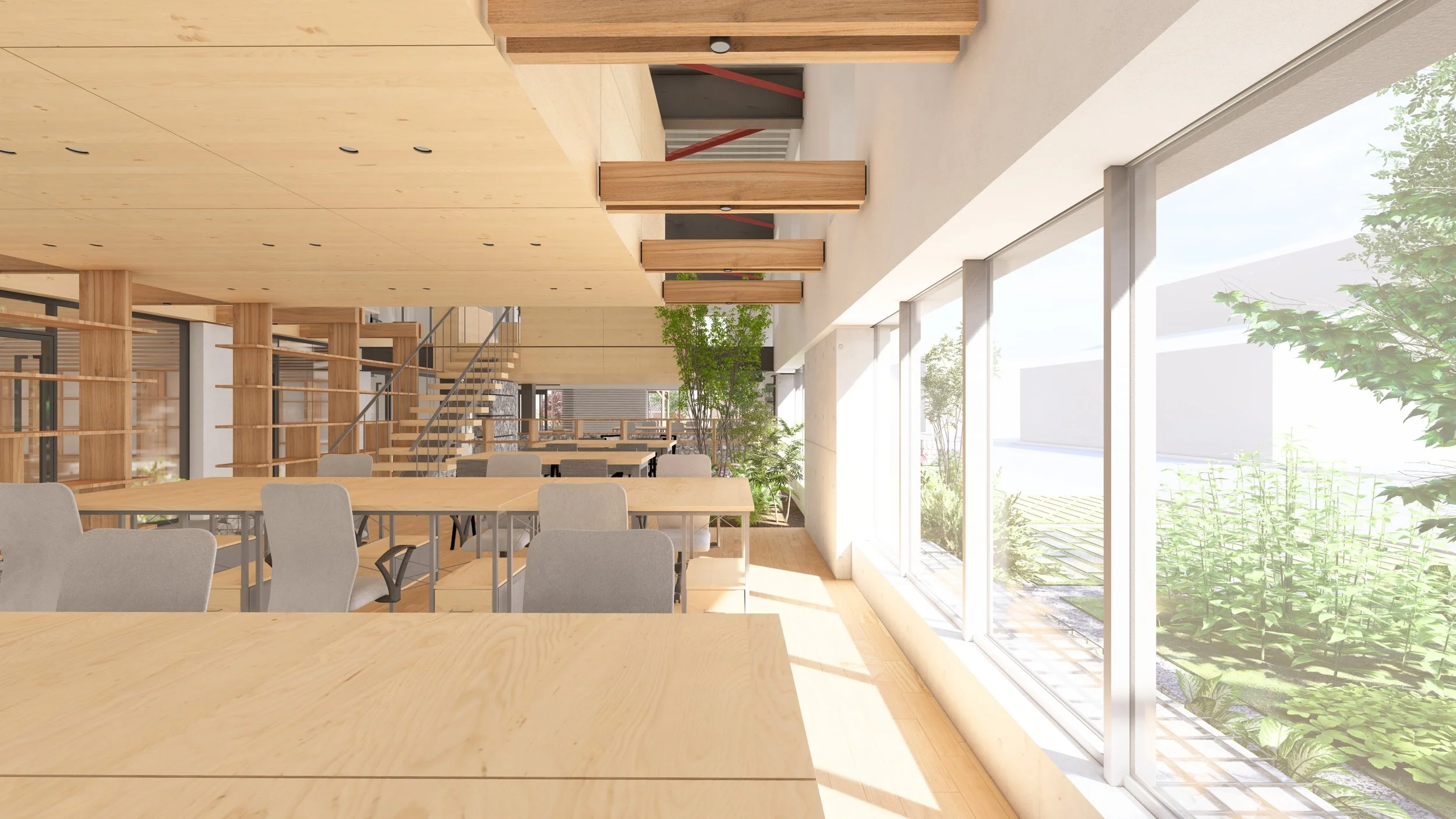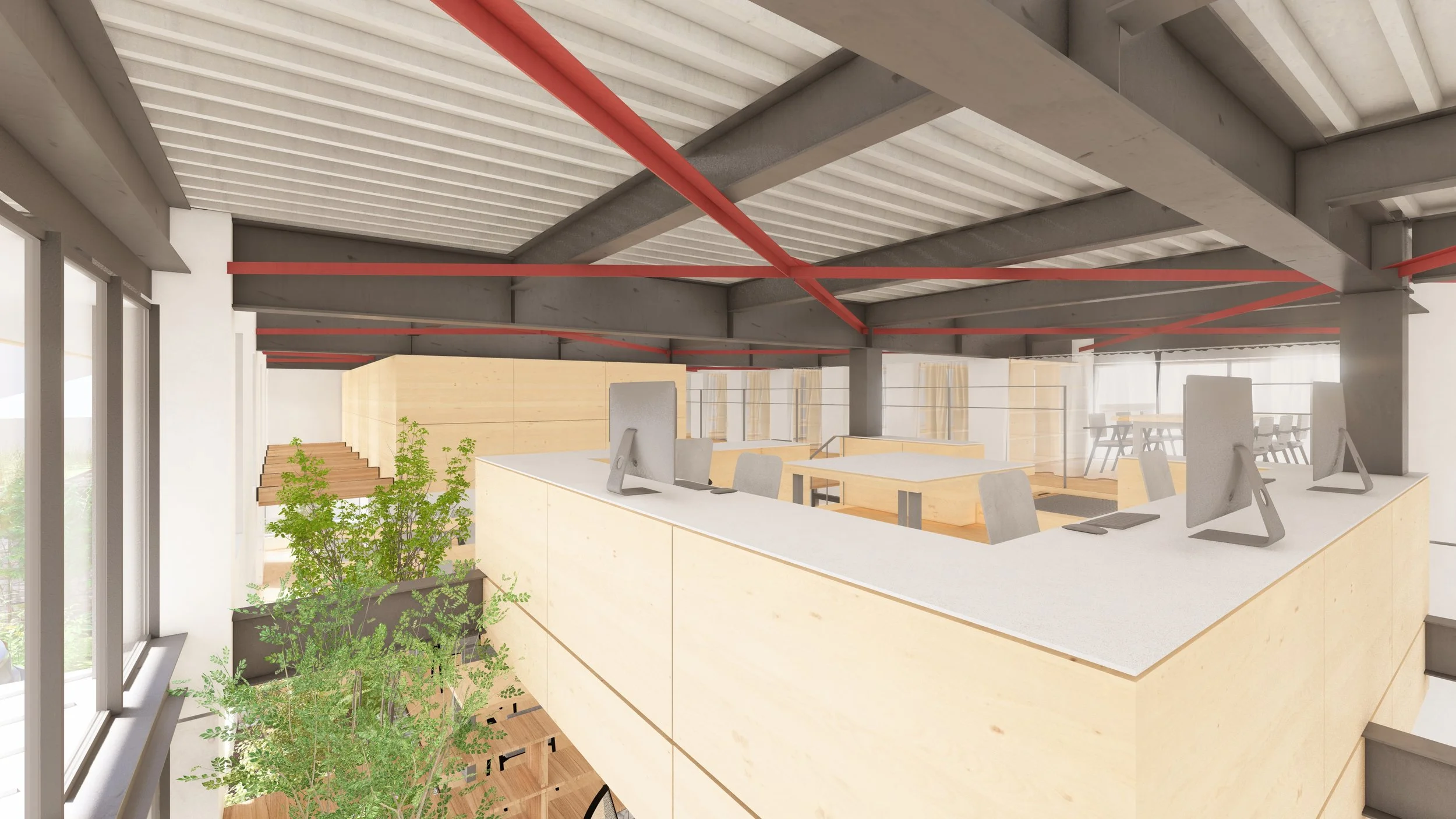 オープンオフィスへ、2つの“木のハコ”を浮かせることを考えた。