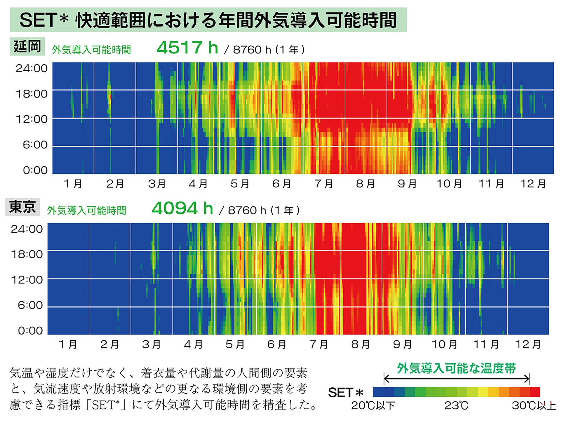 延岡と東京を比較すると、延岡では人が快適と感じるSET*20~30℃の範囲に収まる時間が長く、外気を取り入れ、冷暖房なしで過ごせる時間が多いことがわかります。