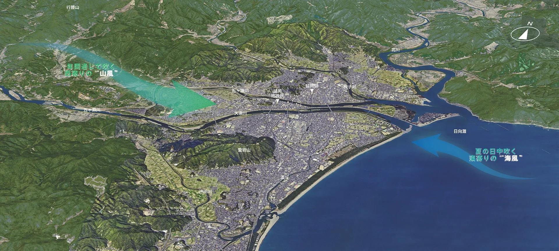 延岡では一年を通じて西風が吹きますが、夏になると風は姿を変えます。昼間は日向灘からの海風が内陸へ、夜は山から冷気が川を伝って下る──そんな局所風がまちの呼吸をつくります。